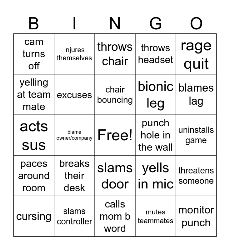 This bingo card has a free space and 24 words: breaks their desk, slams controller, chair bouncing, cursing, rage quit, cam turns off, yelling at team mate, injures themselves, punch hole in the wall, slams door, bionic leg, acts sus, yells in mic, threatens someone, excuses, mutes teammates, uninstalls game, throws chair, blames lag, blame owner/company, monitor punch, paces around room, throws headset and calls mom b word.