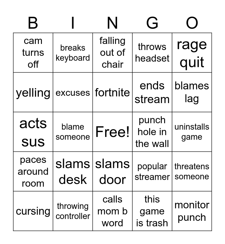 This bingo card has a free space and 24 words: slams desk, throwing controller, fortnite, cursing, rage quit, cam turns off, yelling, breaks keyboard, punch hole in the wall, slams door, ends stream, acts sus, popular streamer, threatens someone, excuses, this game is trash, uninstalls game, falling out of chair, blames lag, blame someone, monitor punch, paces around room, throws headset and calls mom b word.