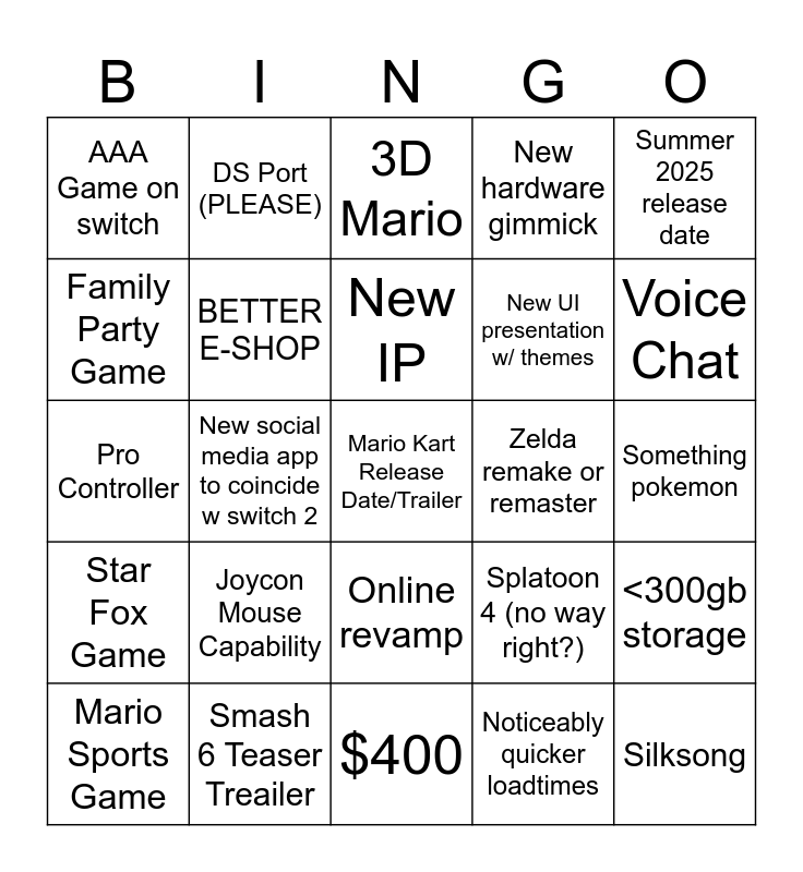This bingo card has a free space and 24 words: Joycon Mouse Capability, Smash 6 Teaser Treailer, New IP, Mario Sports Game, Summer 2025 release date, AAA Game on switch, Family Party Game, DS Port (PLEASE), Zelda remake or remaster, Online revamp, New UI presentation w/ themes, Pro Controller, Splatoon 4 (no way right?), <300gb storage, BETTER E-SHOP, Noticeably quicker loadtimes, Something pokemon, 3D Mario, Voice Chat, New social media app to coincide w switch 2, Silksong, Star Fox Game, New hardware gimmick and $400.