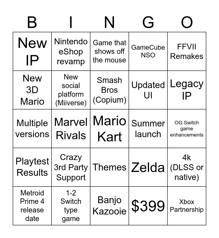 This bingo card has a free space and 24 words: Crazy 3rd Party Support, 1-2 Switch type game, Smash Bros (Copium), Metroid Prime 4 release date, FFVII Remakes, New IP, New 3D Mario, Nintendo eShop revamp, Summer launch, Themes, Updated UI, Multiple versions, Zelda, 4k (DLSS or native), New social platform (Miiverse), $399, OG Switch game enhancements, Game that shows off the mouse, Legacy IP, Marvel Rivals, Xbox Partnership, Playtest Results, GameCube NSO and Banjo Kazooie.
