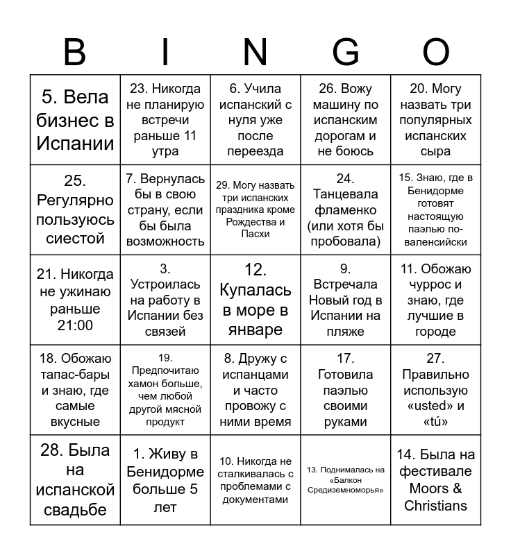 This bingo card has 30 words: 1. Живу в Бенидорме больше 5 лет, 2. Разговариваю на испанском без акцента, 3. Устроилась на работу в Испании без связей, 4. Купила недвижимость в Испании, 5. Вела бизнес в Испании, 6. Учила испанский с нуля уже после переезда, 7. Вернулась бы в свою страну, если бы была возможность, 8. Дружу с испанцами и часто провожу с ними время, 9. Встречала Новый год в Испании на пляже, 10. Никогда не сталкивалась с проблемами с документами, 11. Обожаю чуррос и знаю, где лучшие в городе, 12. Купалась в море в январе, 13. Поднималась на «Балкон Средиземноморья», 14. Была на фестивале Moors & Christians, 15. Знаю, где в Бенидорме готовят настоящую паэлью по-валенсийски, 16. Люблю гулять по Старому городу, 17. Готовила паэлью своими руками, 18. Обожаю тапас-бары и знаю, где самые вкусные, 19. Предпочитаю хамон больше, чем любой другой мясной продукт, 20. Могу назвать три популярных испанских сыра, 21. Никогда не ужинаю раньше 21:00, 22. Обожаю чуррос, 23. Никогда не планирую встречи раньше 11 утра, 24. Танцевала фламенко (или хотя бы пробовала), 25. Регулярно пользуюсь сиестой, 26. Вожу машину по испанским дорогам и не боюсь, 27. Правильно использую «usted» и «tú», 28. Была на испанской свадьбе, 29. Могу назвать три испанских праздника кроме Рождества и Пасхи and 30. Никогда не опаздываю, несмотря на испанские традиции.