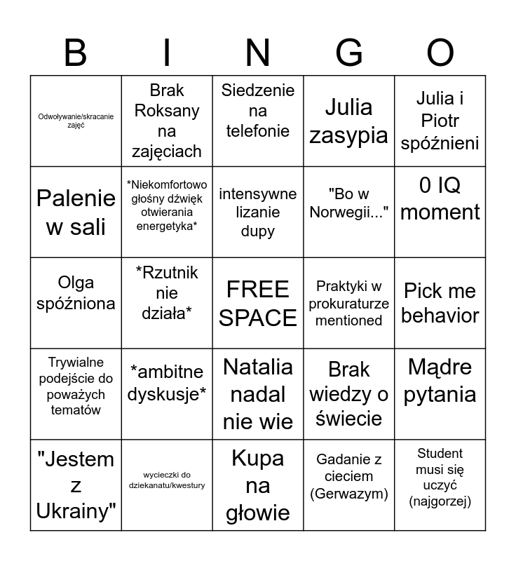 This bingo card has a free space and 24 words: *ambitne dyskusje*, wycieczki do dziekanatu/kwestury, intensywne lizanie dupy, "Jestem z Ukrainy", Julia i Piotr spóźnieni, Odwoływanie/skracanie zajęć, Palenie w sali, Brak Roksany na zajęciach, Praktyki w prokuraturze mentioned, Natalia nadal nie wie, "Bo w Norwegii...", Olga spóźniona, Brak wiedzy o świecie, Mądre pytania, *Niekomfortowo głośny dźwięk otwierania energetyka*, Gadanie z cieciem (Gerwazym), Pick me behavior, Siedzenie na telefonie, 0 IQ moment, *Rzutnik nie działa*, Student musi się uczyć (najgorzej), Trywialne podejście do poważych tematów, Julia zasypia and Kupa na głowie.