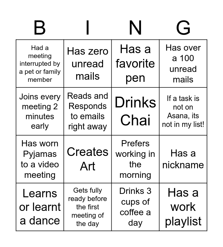 This bingo card has 16 words: Gets fully ready before the first meeting of the day, Has a nickname, Has a favorite pen, Had a meeting interrupted by a pet or family member, Has worn Pyjamas to a video meeting, Has zero unread mails, Prefers working in the morning, Drinks 3 cups of coffee a day, Joins every meeting 2 minutes early, Reads and Responds to emails right away, Learns or learnt a dance, Has over a 100 unread mails, Creates Art, If a task is not on Asana, its not in my list!, Drinks Chai and Has a work playlist.