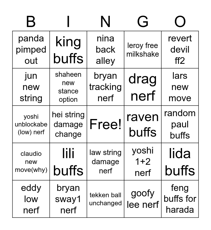 This bingo card has a free space and 24 words: lili buffs, bryan sway1 nerf, bryan tracking nerf, eddy low nerf, revert devil ff2, panda pimped out, jun new string, king buffs, raven buffs, law string damage nerf, drag nerf, yoshi unblockabe (low) nerf, yoshi 1+2 nerf, lida buffs, shaheen new stance option, goofy lee nerf, random paul buffs, nina back alley, lars new move, hei string damage change, feng buffs for harada, claudio new move(why), leroy free milkshake and tekken ball unchanged.