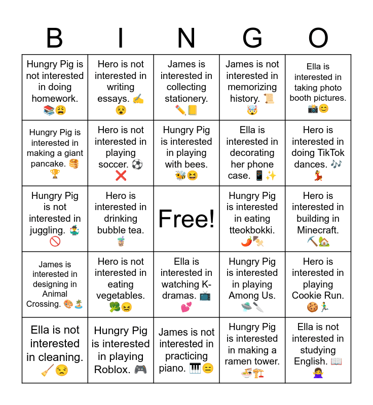 This bingo card has a free space and 30 words: Hungry Pig is interested in playing Roblox. ๐ฎ, James is not interested in knitting. ๐งถ, Hero is interested in drinking bubble tea. ๐ง, Ella is not interested in playing Valorant. ๐ซ๐ฏ, Hungry Pig is not interested in doing homework. ๐๐ฉ, James is interested in collecting stationery. โ๏ธ๐, Hero is not interested in playing soccer. โฝโ, Ella is interested in watching K-dramas. ๐บ๐, Hungry Pig is interested in eating tteokbokki. ๐ถ๏ธ๐ข, James is not interested in practicing piano. ๐น๐, Hero is interested in building in Minecraft. โ๏ธ๐ก, Ella is not interested in studying English. ๐๐ โโ๏ธ, Hungry Pig is interested in making a ramen tower. ๐๐๏ธ, James is not interested in waking up early. โฐ๐ด, Hero is interested in doing TikTok dances. ๐ถ๐, Ella is not interested in running. ๐โโ๏ธโ, Hungry Pig is interested in playing Among Us. ๐ธ๐ช, James is interested in designing in Animal Crossing. ๐จ๐๏ธ, Hero is not interested in eating vegetables. ๐ฅฆ๐, Ella is interested in taking photo booth pictures. ๐ธ๐, Hungry Pig is not interested in juggling. ๐คนโโ๏ธ๐ซ, James is interested in winning a claw machine prize. ๐๐งธ, Hero is not interested in writing essays. โ๏ธ๐ต, Ella is interested in decorating her phone case. ๐ฑโจ, Hungry Pig is interested in making a giant pancake. ๐ฅ๐, James is not interested in memorizing history. ๐๐คฏ, Hero is interested in playing Cookie Run. ๐ช๐โโ๏ธ, Ella is not interested in cleaning. ๐งน๐, Hungry Pig is interested in playing with bees. ๐๐ and James is not interested in eating sausages. ๐ญโ.