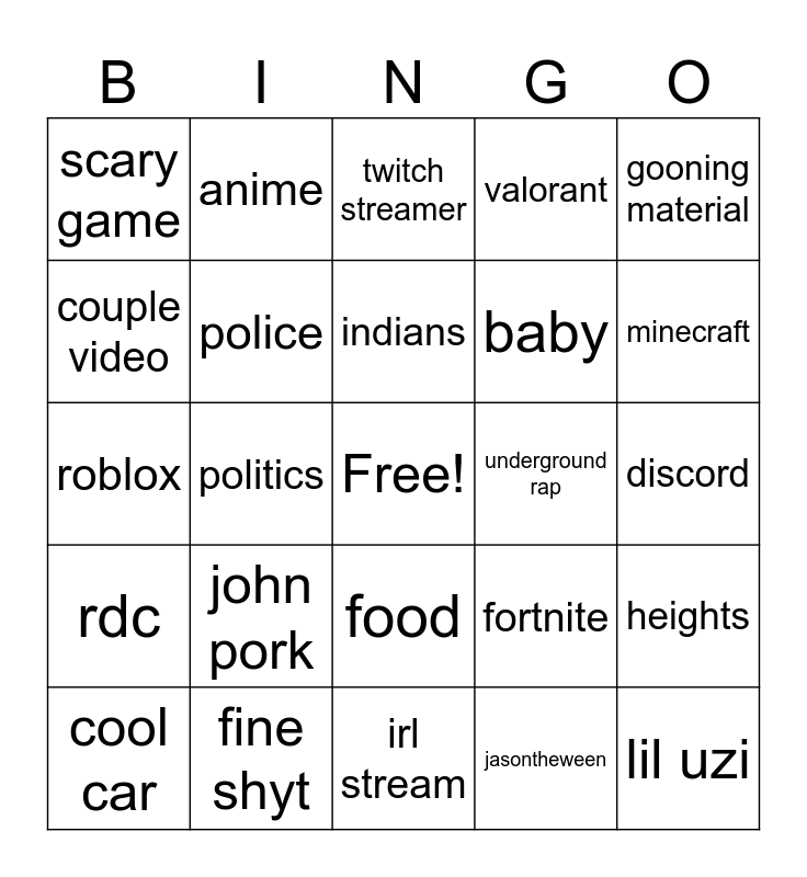 This bingo card has a free space and 24 words: john pork, fine shyt, indians, cool car, gooning material, scary game, couple video, anime, underground rap, food, baby, roblox, fortnite, heights, police, jasontheween, discord, twitch streamer, minecraft, politics, lil uzi, rdc, valorant and irl stream.