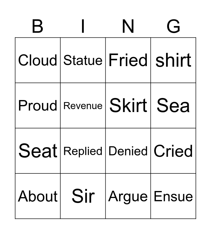 This bingo card has 16 words: Sir, Cried, Fried, Cloud, Seat, Statue, Denied, Argue, Proud, Revenue, About, shirt, Replied, Sea, Skirt and Ensue.