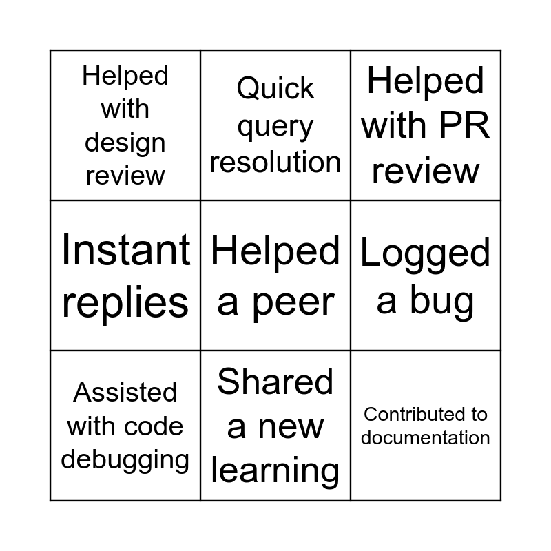 This bingo card has 9 words: Assisted with code debugging, Helped with PR review, Quick query resolution, Instant replies, Helped with design review, Logged a bug, Helped a peer, Contributed to documentation and Shared a new learning.