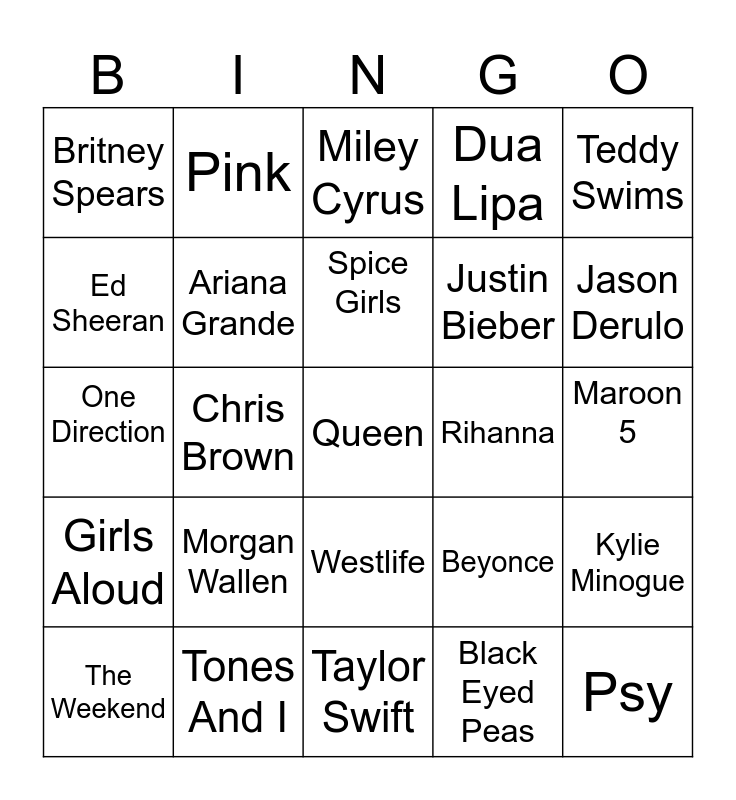 This bingo card has 25 words: Girls Aloud, Tones And I, Queen, Black Eyed Peas, Teddy Swims, Britney Spears, Pink, Miley Cyrus, Rihanna, Kylie Minogue, Ed Sheeran, Ariana Grande, Taylor Swift, Beyonce, Jason Derulo, The Weekend, Chris Brown, Spice Girls, Justin Bieber, Maroon 5, One Direction, Morgan Wallen, Westlife, Dua Lipa and Psy.