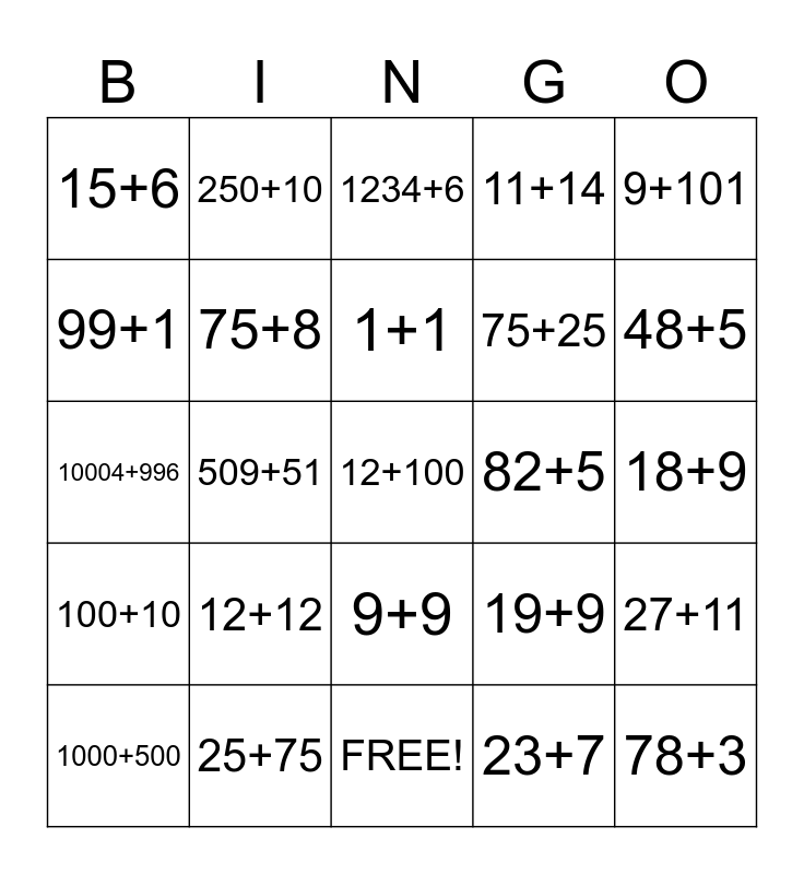 This bingo card has 25 words: 100+10, 25+75, 12+100, 23+7, 9+101, 15+6, 250+10, 1234+6, 82+5, 27+11, 99+1, 75+8, FREE!, 19+9, 48+5, 1000+500, 509+51, 1+1, 75+25, 18+9, 10004+996, 12+12, 9+9, 11+14 and 78+3.