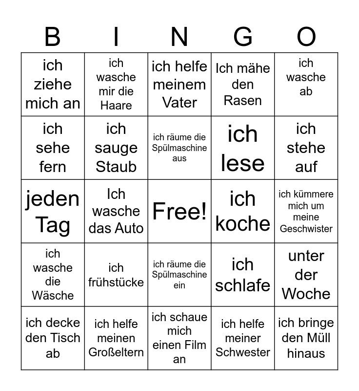 This bingo card has a free space and 39 words: ich putze, ich räume auf, ich bügle, ich sauge Staub, ich decke den Tisch ab, ich räume die Spülmaschine ein, ich räume die Spülmaschine aus, ich trenne den Müll, ich wasche ab, ich wasche die Wäsche, Ich wasche das Auto, Ich mähe den Rasen, ich bringe den Müll hinaus, ich kümmere mich um meine Geschwister, ich koche, ich frühstücke, ich dusche mich, ich ziehe mich an, ich entspanne mich, ich schlafe, ich sehe fern, ich schaue mich einen Film an, ich lese, ich stehe auf, ich ruhe mich aus, ich putze mir die Zähne, ich wasche mir das Gesicht, ich gehe nach Hause, ich gehe aus dem Haus, ich wasche mir die Haare, ich wasche meinen Hund, ich helfe meiner Mutter, ich helfe meinem Vater, ich helfe meinen Großeltern, ich helfe meiner Schwester, ich helfe meinen Geschwistern, unter der Woche, jeden Tag and am Wochenende.