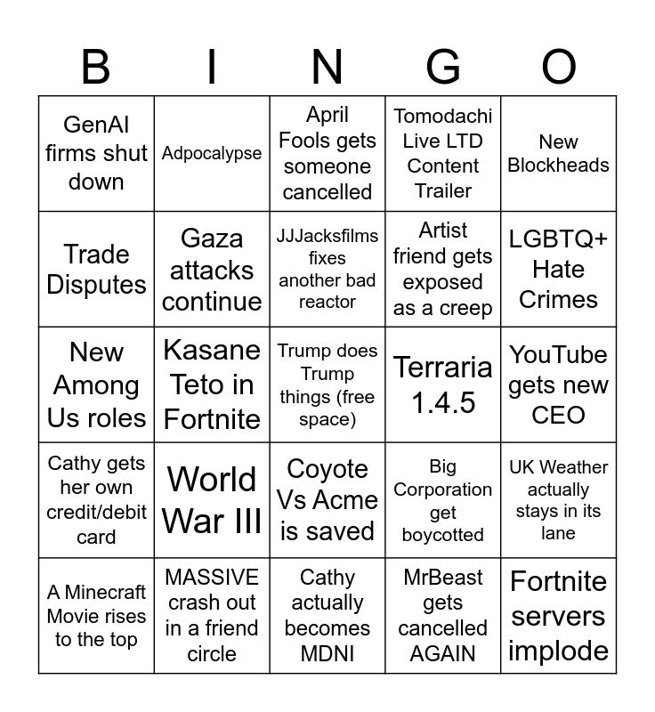 This bingo card has a free space and 24 words: World War III, MASSIVE crash out in a friend circle, JJJacksfilms fixes another bad reactor, A Minecraft Movie rises to the top, New Blockheads, GenAI firms shut down, Trade Disputes, Adpocalypse, Terraria 1.4.5, Coyote Vs Acme is saved, Artist friend gets exposed as a creep, New Among Us roles, Big Corporation get boycotted, UK Weather actually stays in its lane, Gaza attacks continue, MrBeast gets cancelled AGAIN, YouTube gets new CEO, April Fools gets someone cancelled, LGBTQ+ Hate Crimes, Kasane Teto in Fortnite, Fortnite servers implode, Cathy gets her own credit/debit card, Tomodachi Live LTD Content Trailer and Cathy actually becomes MDNI.
