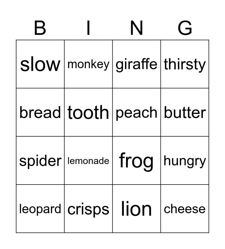 This bingo card has 36 words: chef, omelette, cherry, peach, egg, cheese, butter, fruit, bread, tomato, hungry, thirsty, water, crisps, lemonade, slow, fast, hippo, leopard, giraffe, lion, zebra, rhino, mouse, bat, monkey, frog, hedgehog, spider, tooth, hand, finger, paw, fur, tail and wing.
