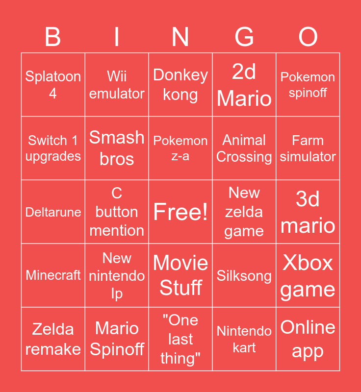 This bingo card has a free space and 24 words: New nintendo Ip, Mario Spinoff, Pokemon z-a, Zelda remake, Pokemon spinoff, Splatoon 4, Switch 1 upgrades, Wii emulator, New zelda game, Movie Stuff, Animal Crossing, Deltarune, Silksong, Xbox game, Smash bros, Nintendo kart, 3d mario, Donkey kong, Farm simulator, C button mention, Online app, Minecraft, 2d Mario and "One last thing".