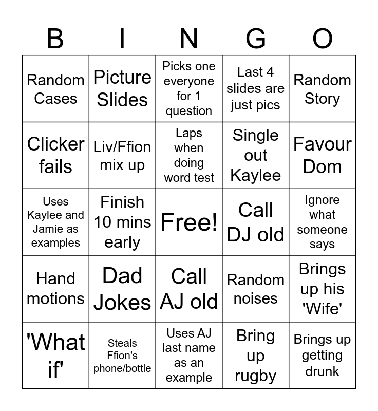 This bingo card has a free space and 24 words: Dad Jokes, Steals Ffion's phone/bottle, Laps when doing word test, 'What if', Random Story, Random Cases, Clicker fails, Picture Slides, Call DJ old, Call AJ old, Single out Kaylee, Uses Kaylee and Jamie as examples, Random noises, Brings up his 'Wife', Liv/Ffion mix up, Bring up rugby, Ignore what someone says, Picks one everyone for 1 question, Favour Dom, Finish 10 mins early, Brings up getting drunk, Hand motions, Last 4 slides are just pics and Uses AJ last name as an example.
