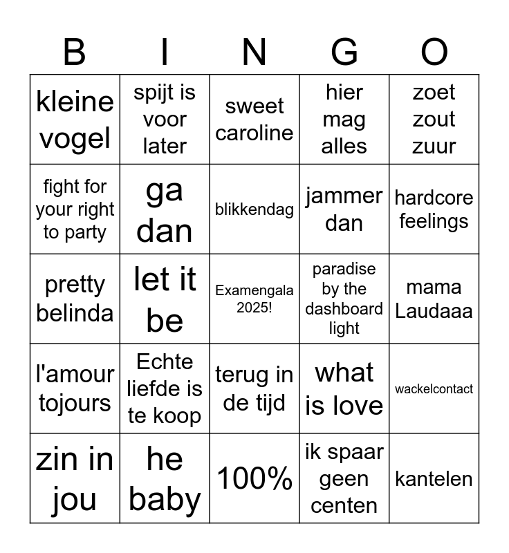 This bingo card has a free space and 25 words: Echte liefde is te koop, 100%, blikkendag, zin in jou, zoet zout zuur, kleine vogel, fight for your right to party, spijt is voor later, paradise by the dashboard light, terug in de tijd, jammer dan, pretty belinda, what is love, wackelcontact, ga dan, rainbow high in the sky, mama Laudaaa, sweet caroline, hardcore feelings, let it be, kantelen, he baby, l'amour tojours, hier mag alles and ik spaar geen centen.