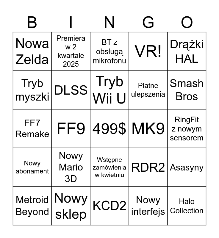 This bingo card has a free space and 24 words: Nowy Mario 3D, Nowy sklep, Tryb Wii U, Metroid Beyond, Drążki HAL, Nowa Zelda, Tryb myszki, Premiera w 2 kwartale 2025, MK9, Wstępne zamówienia w kwietniu, Płatne ulepszenia, FF7 Remake, RDR2, Asasyny, DLSS, Nowy interfejs, RingFit z nowym sensorem, BT z obsługą mikrofonu, Smash Bros, FF9, Halo Collection, Nowy abonament, VR! and KCD2.