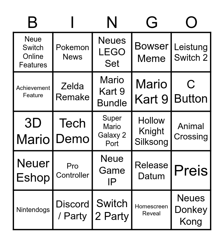 This bingo card has 25 words: Pro Controller, Switch 2 Party, Mario Kart 9 Bundle, Nintendogs, Leistung Switch 2, Neue Switch Online Features, Achievement Feature, Pokemon News, Hollow Knight Silksong, Neue Game IP, Mario Kart 9, 3D Mario, Release Datum, Preis, Zelda Remake, Neues Donkey Kong, Animal Crossing, Neues LEGO Set, C Button, Tech Demo, Super Mario Galaxy 2 Port, Discord / Party, Neuer Eshop, Bowser Meme and Homescreen Reveal.