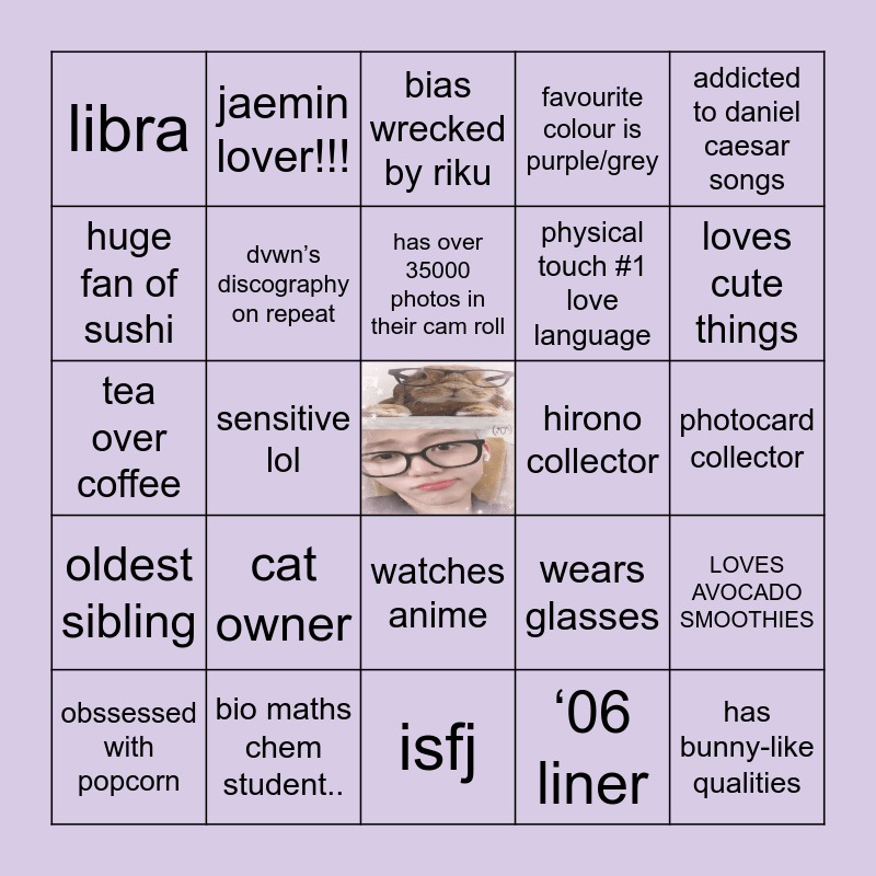 This bingo card has a free space and 24 words: cat owner, bio maths chem student.., has over 35000 photos in their cam roll, obssessed with popcorn, addicted to daniel caesar songs, libra, huge fan of sushi, jaemin lover!!!, hirono collector, watches anime, physical touch #1 love language, tea over coffee, wears glasses, LOVES AVOCADO SMOOTHIES, dvwn’s discography on repeat, ‘06 liner, photocard collector, bias wrecked by riku, loves cute things, sensitive lol, has bunny-like qualities, oldest sibling, favourite colour is purple/grey and isfj.