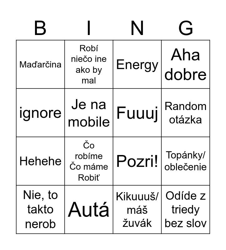 This bingo card has 16 words: Autá, Topánky/ oblečenie, Energy, Maďarčina, Hehehe, Robí niečo ine ako by mal, Pozri!, Kikuuuš/ máš žuvák, ignore, Je na mobile, Nie, to takto nerob, Aha dobre, Čo robíme Čo máme Robiť, Random otázka, Fuuuj and Odíde z triedy bez slov.