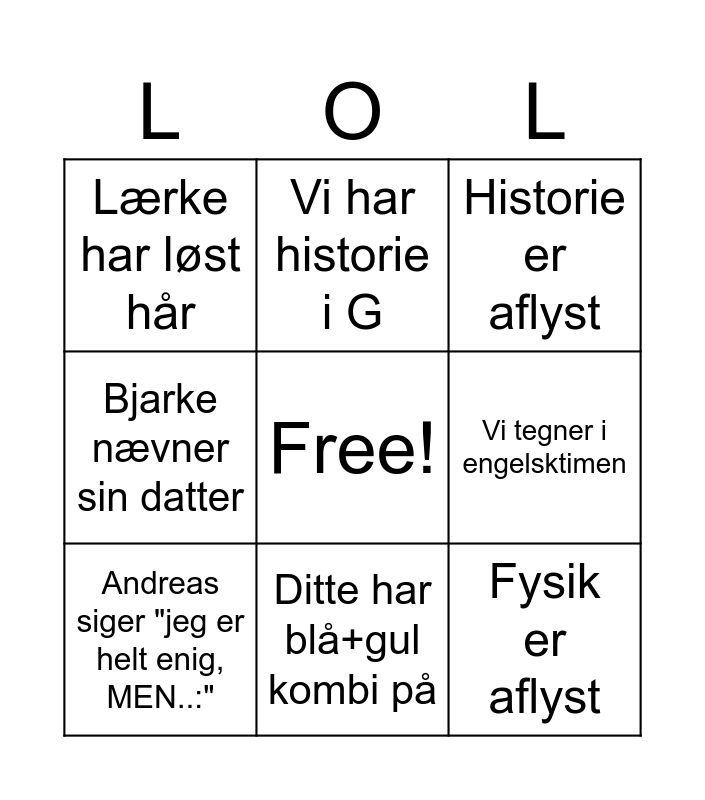 This bingo card has a free space and 55 words: Karina siger "rwørps", Lasse udstiller en elev, Lasse laver dad-joke, Lærke har løst hår, Maria siger "so just pull out your...", Karina skælder folk der drikker vand ud, Andreas siger "jeg er helt enig, MEN..:", Lasse hentyder til noget seksuelt, Camilla siger "på gulvet", Camilla laver øen, Bjarke nævner sin datter, Bjarke går på sidespor med meningen med universet, Lærkes powerpoint varer 30 min, Peter Kennebo kommer ind, Lasse har ekstrem stram t-shirt på, Andreas sætter film på, Fysik er aflyst, Sprog er aflyst, Idræt er aflyst, Engelsk er aflyst, Dansk er aflyst, Mat er aflyst, Kemi er aflyst, Historie er aflyst, Samf er aflyst, Ditte har blå+gul kombi på, Ditte har slik med, Lasse kommer for sent, Lasse drikker espresso, Lasse nævner CrossFit, Man kan se Lasses motivational PC baggrund, Man kan se Lærkes baggrund, Man kan se Marias yoga baggrund, En lærer siger "nu er i jo også designelever...", Vi tegner i engelsktimen, Vi tegner i dansktimen, Vi tegner i design, Vi bruger whiteboards i mat, Vi bruger whiteboards i samf, Lasse har meggings på, Vi har historie i G, Vi har time i M, Camilla har støvler på, Lærke har mindst 4 kæmpe ringe på, Lasse ikke har briller på, Kantinen er lukket, Vi spiser kage i mat, Lone kommer ind, Mindst 6 er fraværende, Nogen kommer ind og snakker om elev udvalg, Nogen mister deres Bingo-kort, Når en lærer kommenterer på, at der bliver sagt bingo, En lærer nævner AI eller ChatGPT, En ders sidder ved dit bord siger bingo and Man ser en lærer uden for skolen.