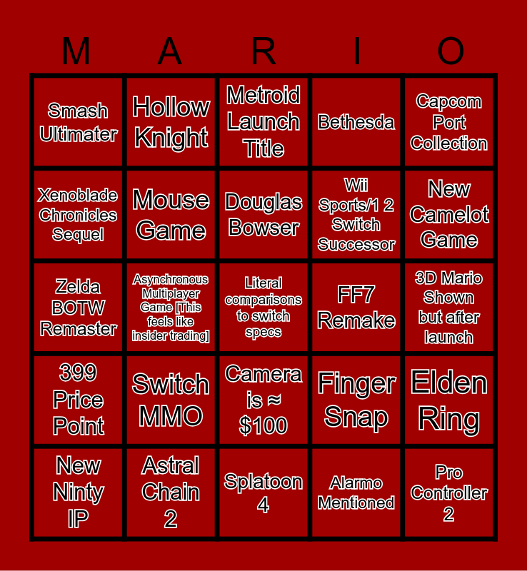 This bingo card has 25 words: Switch MMO, Splatoon 4, Douglas Bowser, New Ninty IP, Capcom Port Collection, Smash Ultimater, Xenoblade Chronicles Sequel, Hollow Knight, FF7 Remake, Camera is ≈ $100, Wii Sports/1 2 Switch Successor, Zelda BOTW Remaster, Finger Snap, Elden Ring, Mouse Game, Pro Controller 2, 3D Mario Shown but after launch, Metroid Launch Title, New Camelot Game, Asynchronous Multiplayer Game [This feels like insider trading], Literal comparisons to switch specs, Astral Chain 2, 399 Price Point, Bethesda and Alarmo Mentioned.