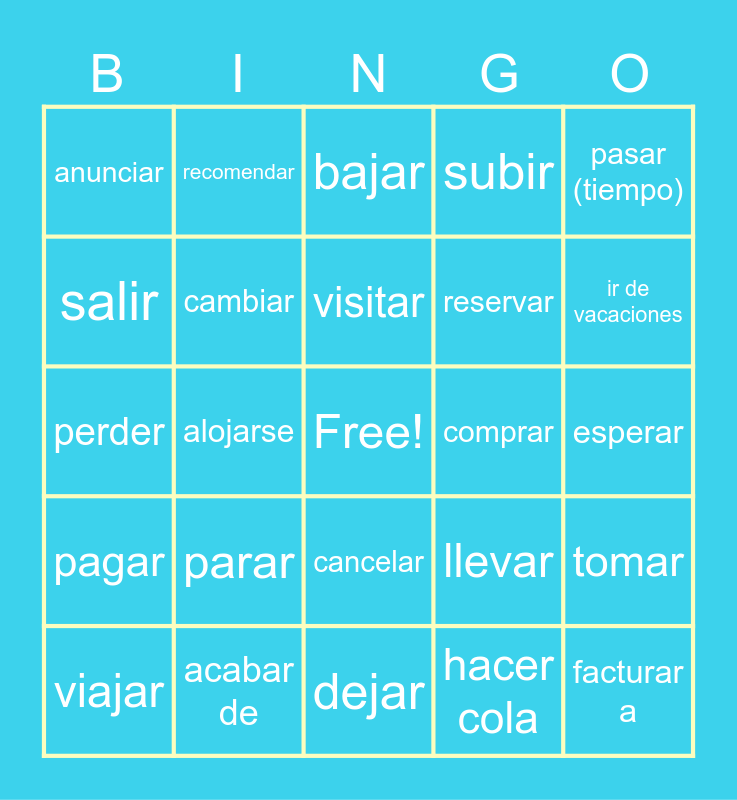 This bingo card has a free space and 30 words: acabar de, aceptar, alojarse, alquilar, anunciar, bajar, cambiar, cancelar, comprar, dejar, esperar, facturar a, hacer cola, hacer la maleta, ir de vacaciones, llegar, llevar, pagar, parar, pasar (tiempo), perder, quedarse, recomendar, reservar, salir, subir, tomar, viajar, visitar and volver.