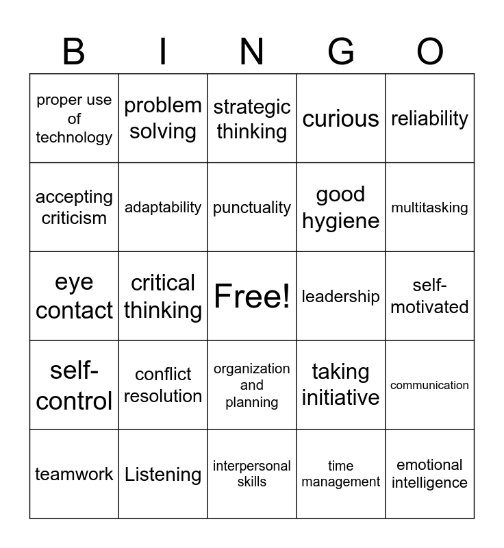 This bingo card has a free space and 24 words: conflict resolution, Listening, punctuality, teamwork, reliability, proper use of technology, accepting criticism, problem solving, leadership, organization and planning, good hygiene, eye contact, taking initiative, communication, adaptability, time management, self-motivated, strategic thinking, multitasking, critical thinking, emotional intelligence, self-control, curious and interpersonal skills.
