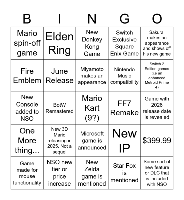 This bingo card has a free space and 25 words: New 3D Mario releasing in 2025. Not a sequel, New Zelda game is mentioned, Miyamoto makes an appearance, Game made for mouse functionality, Sakurai makes an appearance and shows off his new game, Mario spin-off game, Fire Emblem, Elden Ring, FF7 Remake, Microsoft game is announced, Nintendo Music compatibility, New Console added to NSO, New IP, $399.99, June Release, Furukawa and Doug Bowser make an appearance, Game with 2026 release date is revealed, New Donkey Kong Game, Switch 2 Edition games (i.e an enhanced Metroid Prime 4), BotW Remastered, Some sort of new feature or DLC that is included with NSO, NSO new tier or price increase, One More thing..., Switch Exclusive Square Enix Game and Star Fox is mentioned.