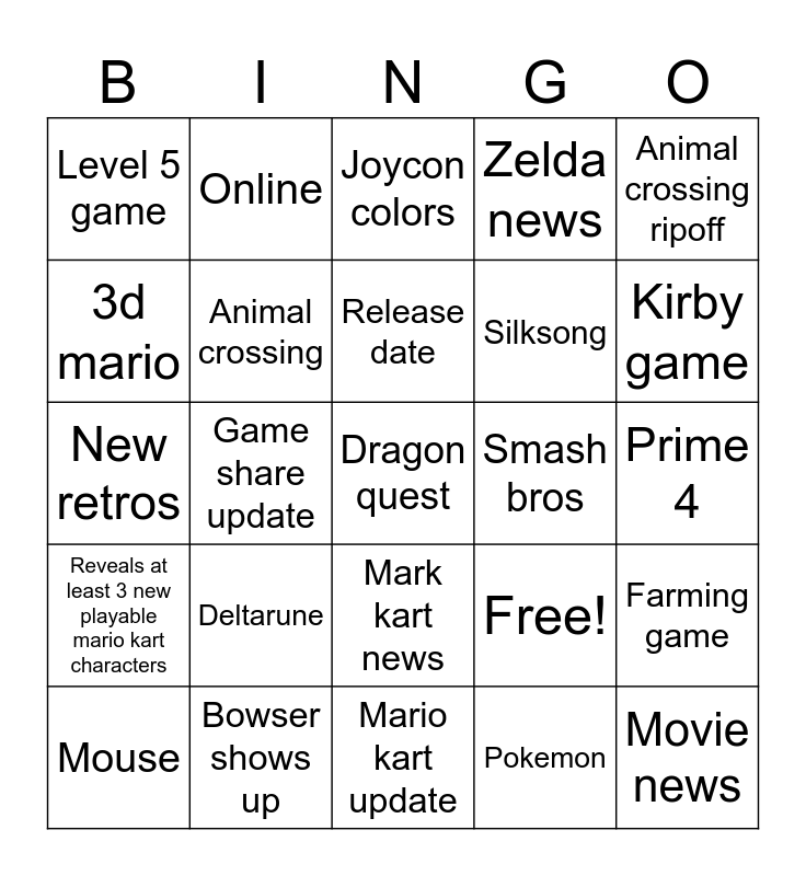 This bingo card has 25 words: Deltarune, Mario kart update, Release date, Mouse, Animal crossing ripoff, Level 5 game, 3d mario, Online, Smash bros, Mark kart news, Silksong, New retros, Free!, Farming game, Animal crossing, Movie news, Prime 4, Joycon colors, Kirby game, Game share update, Dragon quest, Bowser shows up, Reveals at least 3 new playable mario kart characters, Zelda news and Pokemon.