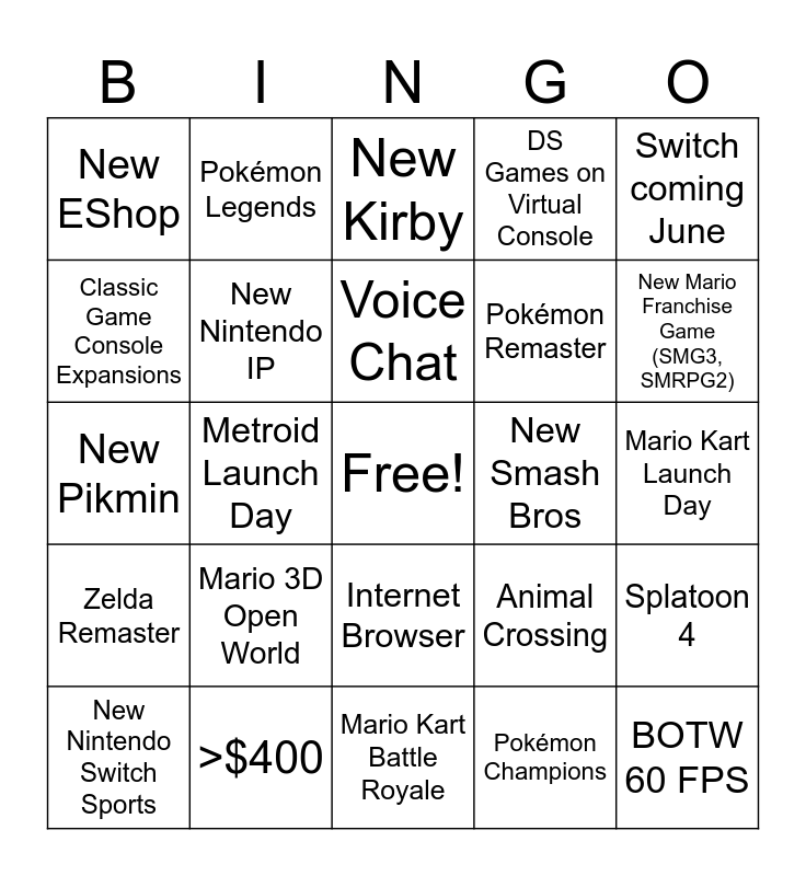 This bingo card has a free space and 24 words: Mario 3D Open World, >$400, Voice Chat, New Nintendo Switch Sports, Switch coming June, New EShop, Classic Game Console Expansions, Pokémon Legends, New Smash Bros, Internet Browser, Pokémon Remaster, New Pikmin, Animal Crossing, Splatoon 4, New Nintendo IP, Pokémon Champions, Mario Kart Launch Day, New Kirby, New Mario Franchise Game (SMG3, SMRPG2), Metroid Launch Day, BOTW 60 FPS, Zelda Remaster, DS Games on Virtual Console and Mario Kart Battle Royale.