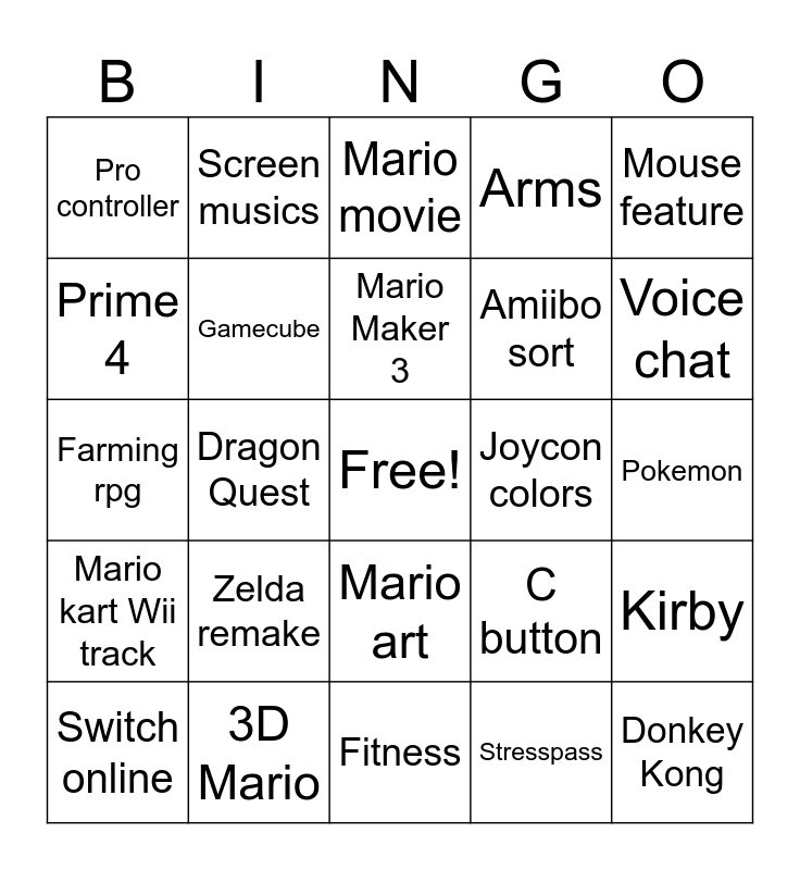 This bingo card has a free space and 24 words: Zelda remake, 3D Mario, Mario Maker 3, Switch online, Mouse feature, Pro controller, Prime 4, Screen musics, Joycon colors, Mario art, Amiibo sort, Farming rpg, C button, Kirby, Gamecube, Stresspass, Pokemon, Mario movie, Voice chat, Dragon Quest, Donkey Kong, Mario kart Wii track, Arms and Fitness.