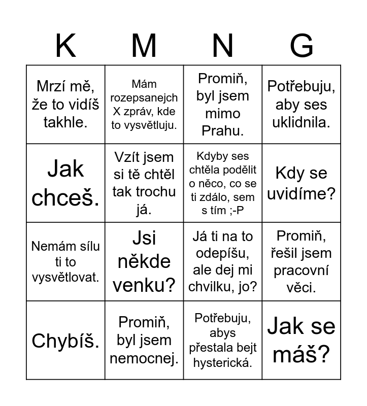 This bingo card has 16 words: Promiň, byl jsem nemocnej., Promiň, řešil jsem pracovní věci., Promiň, byl jsem mimo Prahu., Mrzí mě, že to vidíš takhle., Nemám sílu ti to vysvětlovat., Mám rozepsanejch X zpráv, kde to vysvětluju., Já ti na to odepíšu, ale dej mi chvilku, jo?, Potřebuju, abys přestala bejt hysterická., Jak chceš., Vzít jsem si tě chtěl tak trochu já., Chybíš., Potřebuju, aby ses uklidnila., Jsi někde venku?, Kdy se uvidíme?, Kdyby ses chtěla podělit o něco, co se ti zdálo, sem s tím ;-P and Jak se máš?.