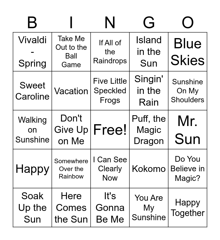 This bingo card has a free space and 24 words: Somewhere Over the Rainbow, Here Comes the Sun, Five Little Speckled Frogs, Soak Up the Sun, Blue Skies, Vivaldi - Spring, Sweet Caroline, Take Me Out to the Ball Game, Puff, the Magic Dragon, I Can See Clearly Now, Singin' in the Rain, Walking on Sunshine, Kokomo, Do You Believe in Magic?, Vacation, You Are My Sunshine, Mr. Sun, If All of the Raindrops, Sunshine On My Shoulders, Don't Give Up on Me, Happy Together, Happy, Island in the Sun and It's Gonna Be Me.