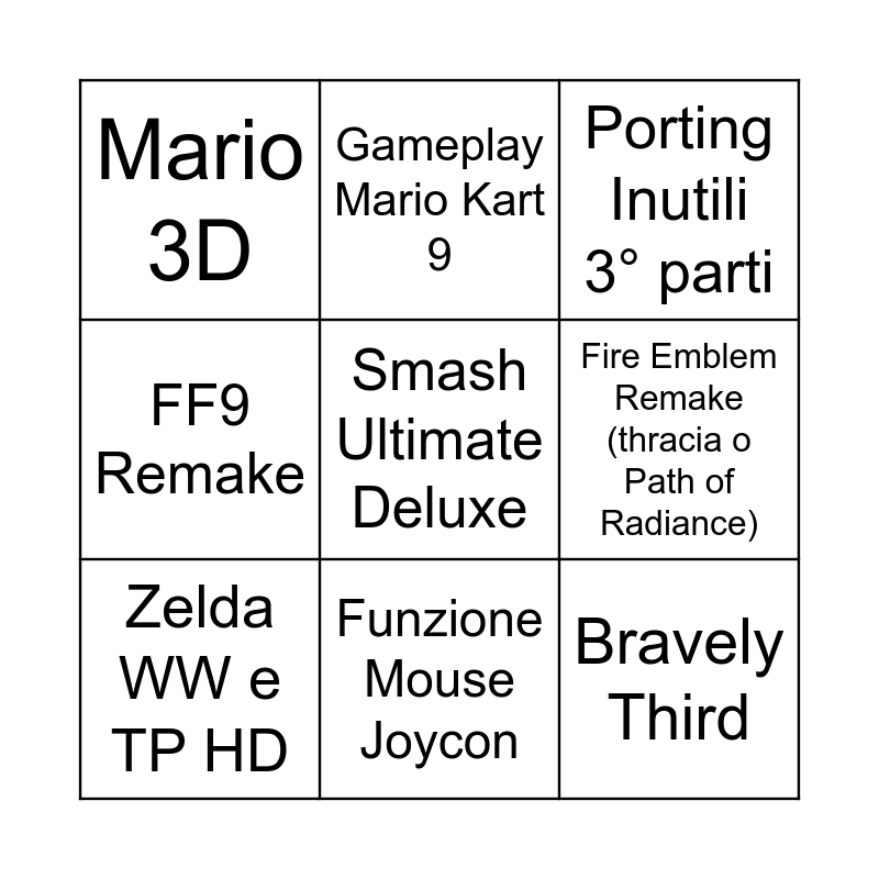 This bingo card has a free space and 8 words: Fire Emblem Remake (thracia o Path of Radiance), Porting Inutili 3° parti, Gameplay Mario Kart 9, Zelda WW e TP HD, Mario 3D, Bravely Third, FF9 Remake and Funzione Mouse Joycon.