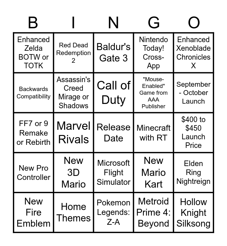 This bingo card has a free space and 24 words: New 3D Mario, Home Themes, Call of Duty, New Fire Emblem, Enhanced Xenoblade Chronicles X, Enhanced Zelda BOTW or TOTK, Backwards Compatibility, Red Dead Redemption 2, Minecraft with RT, Microsoft Flight Simulator, "Mouse-Enabled" Game from AAA Publisher, FF7 or 9 Remake or Rebirth, New Mario Kart, Elden Ring Nightreign, Assassin's Creed Mirage or Shadows, Metroid Prime 4: Beyond, $400 to $450 Launch Price, Baldur's Gate 3, September - October Launch, Marvel Rivals, Hollow Knight Silksong, New Pro Controller, Nintendo Today! Cross-App and Pokemon Legends: Z-A.