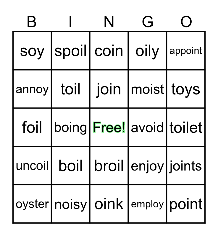 This bingo card has a free space and 24 words: boil, noisy, join, oyster, appoint, soy, annoy, spoil, avoid, broil, moist, foil, enjoy, joints, toil, employ, toilet, coin, toys, boing, point, uncoil, oily and oink.