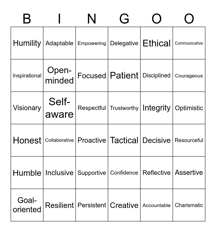 This bingo card has 46 words: Free!, Visionary, Empathetic, Decisive, Integrity, Confidence, Adaptable, Strategic, Communicative, Resilient, Inspirational, Delegative, Collaborative, Honest, Accountable, Supportive, Open-minded, Self-aware, Motivational, Ethical, Courageous, Resourceful, Humility, Focused, Innovative, Patient, Proactive, Flexible, Optimistic, Trustworthy, Disciplined, Inclusive, Creative, Charismatic, Persistent, Tactical, Respectful, Goal-oriented, Fair, Reflective, Humble, Empowering, Disciplined, Problem-solver, Assertive and Compassionate.