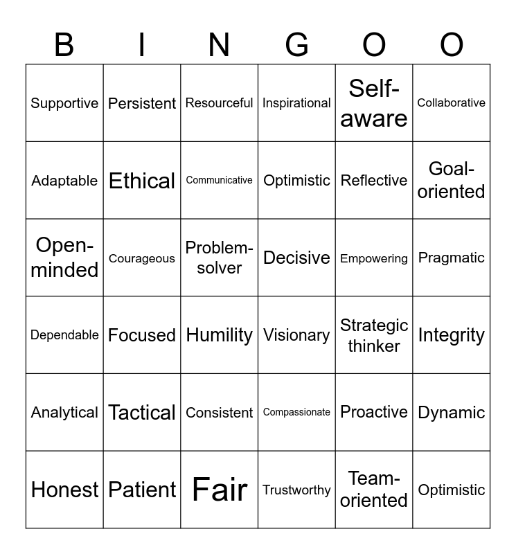 This bingo card has 59 words: Free!, Visionary, Empathetic, Decisive, Integrity, Confidence, Adaptable, Strategic, Communicative, Resilient, Inspirational, Delegative, Collaborative, Honest, Accountable, Supportive, Open-minded, Self-aware, Motivational, Ethical, Courageous, Resourceful, Humility, Focused, Innovative, Patient, Proactive, Flexible, Optimistic, Trustworthy, Disciplined, Inclusive, Creative, Charismatic, Persistent, Tactical, Respectful, Goal-oriented, Fair, Reflective, Humble, Empowering, Problem-solver, Assertive, Compassionate, Independent, Driven, Approachable, Pragmatic, Strategic thinker, Mentoring, Optimistic, Consistent, Dynamic, Team-oriented, Dependable, Listener, Analytical and Influential.