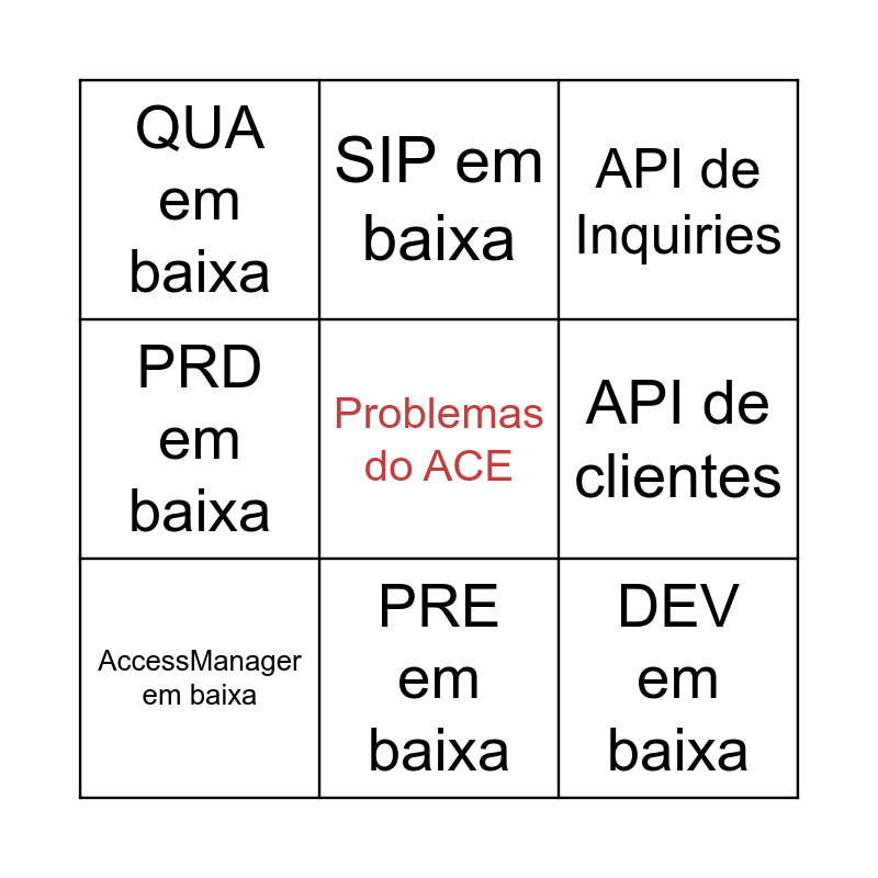 This bingo card has a free space and 8 words: API de clientes, API de Inquiries, SIP em baixa, AccessManager em baixa, QUA em baixa, DEV em baixa, PRD em baixa and PRE em baixa.