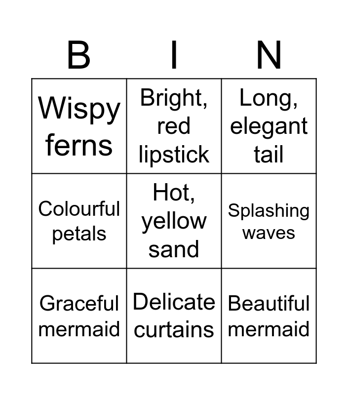 This bingo card has 9 words: Graceful mermaid, Long, elegant tail, Bright, red lipstick, Colourful petals, Wispy ferns, Splashing waves, Hot, yellow sand, Beautiful mermaid and Delicate curtains.