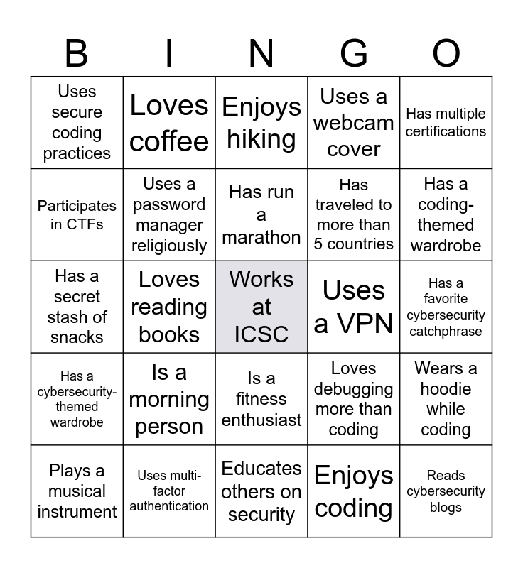 This bingo card has a free space and 24 words: Is a morning person, Uses multi-factor authentication, Has run a marathon, Plays a musical instrument, Has multiple certifications, Uses secure coding practices, Participates in CTFs, Loves coffee, Uses a VPN, Is a fitness enthusiast, Has traveled to more than 5 countries, Has a secret stash of snacks, Loves debugging more than coding, Wears a hoodie while coding, Uses a password manager religiously, Enjoys coding, Has a favorite cybersecurity catchphrase, Enjoys hiking, Has a coding-themed wardrobe, Loves reading books, Reads cybersecurity blogs, Has a cybersecurity-themed wardrobe, Uses a webcam cover and Educates others on security.