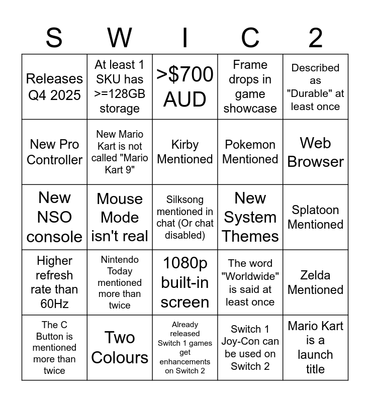This bingo card has a free space and 29 words: The C Button is mentioned more than twice, New Mario Game (Not Mario Kart), Mouse Mode isn't real, Switch 2 Controllers can be used on Switch 1, Releases Q4 2025, >$700 AUD, New Mario Kart is not called "Mario Kart 9", Nintendo Today mentioned more than twice, New System Themes, Two Colours, Splatoon Mentioned, Mario Kart is a launch title, Already released Switch 1 games get enhancements on Switch 2, Switch 1 Joy-Con can be used on Switch 2, Web Browser, C Button is for "Community", 1080p built-in screen, Higher refresh rate than 60Hz, Described as "Durable" at least once, New NSO console, The word "Worldwide" is said at least once, New Mario Kart is 24 players, Pokemon Mentioned, New Pro Controller, Frame drops in game showcase, At least 1 SKU has >=128GB storage, Zelda Mentioned, Kirby Mentioned and Smash Bros Mentioned.