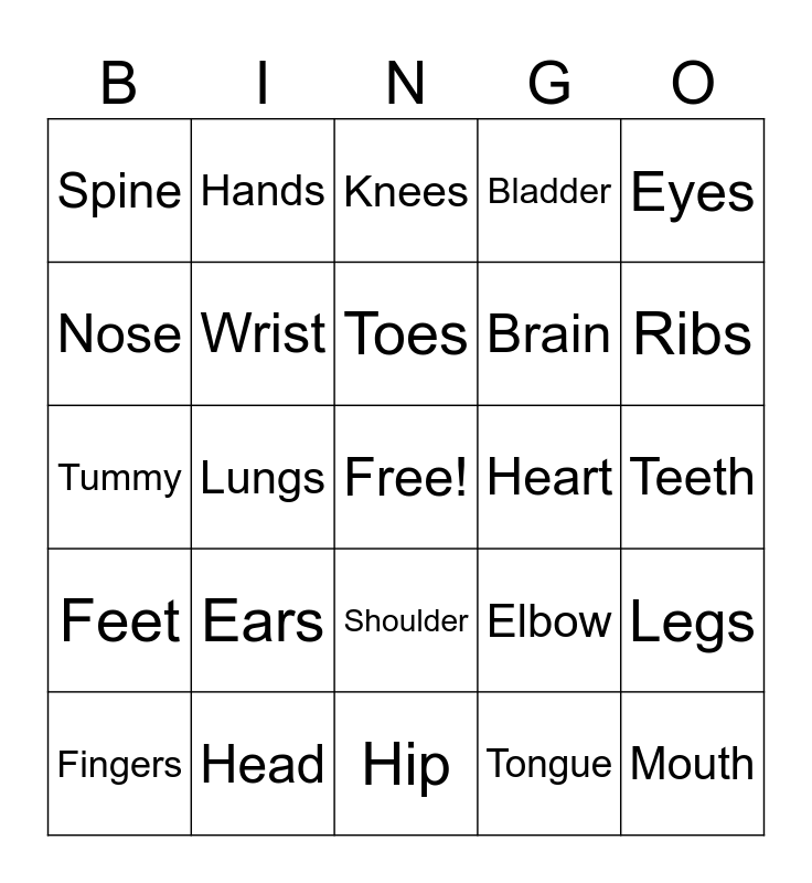 This bingo card has a free space and 24 words: Fingers, Ears, Toes, Tongue, Eyes, Spine, Hands, Knees, Heart, Teeth, Tummy, Wrist, Elbow, Legs, Nose, Head, Hip, Bladder, Ribs, Feet, Lungs, Shoulder, Brain and Mouth.