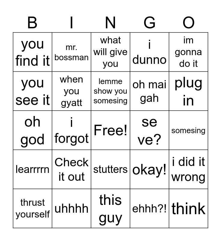 This bingo card has a free space and 24 words: Check it out, uhhhh, lemme show you somesing, thrust yourself, im gonna do it, you find it, you see it, mr. bossman, se ve?, stutters, oh mai gah, oh god, okay!, i did it wrong, when you gyatt, ehhh?!, somesing, what will give you, plug in, i forgot, think, learrrrn, i dunno and this guy.