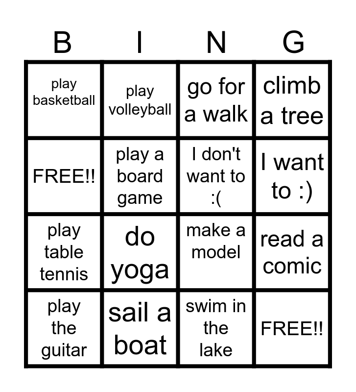 This bingo card has 16 words: sail a boat, read a comic, go for a walk, play basketball, play table tennis, play volleyball, make a model, swim in the lake, FREE!!, play a board game, play the guitar, climb a tree, do yoga, I want to :), I don't want to :( and FREE!!.