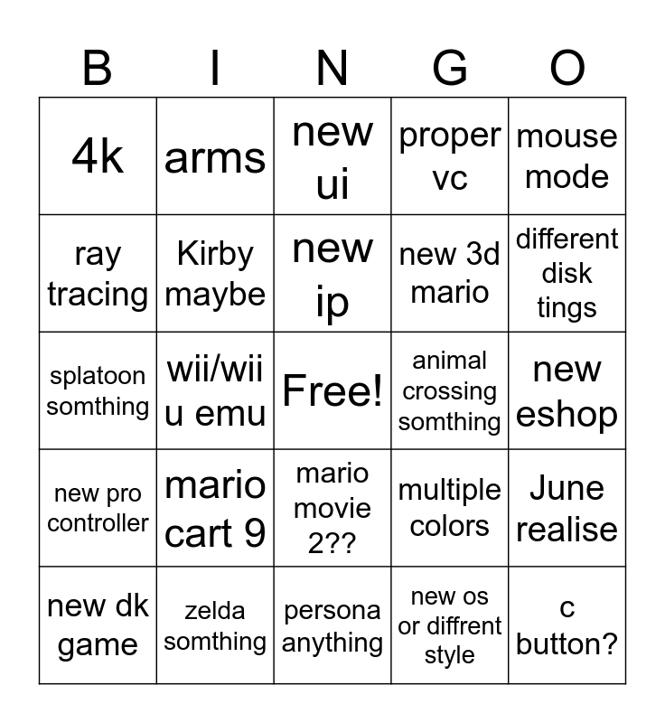 This bingo card has a free space and 24 words: mario cart 9, zelda somthing, new ip, new dk game, mouse mode, 4k, ray tracing, arms, animal crossing somthing, mario movie 2??, new 3d mario, splatoon somthing, multiple colors, June realise, Kirby maybe, new os or diffrent style, new eshop, new ui, different disk tings, wii/wii u emu, c button?, new pro controller, proper vc and persona anything.