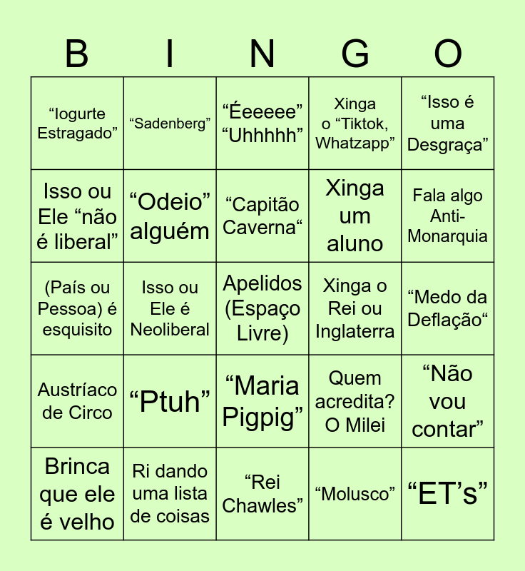 This bingo card has a free space and 40 words: Chama o Milei de Esquisito ou Maluco, (País ou Pessoa) é esquisito, “Vladimir, Putin”, “Odeio” alguém, Ri dando uma lista de coisas, “Maria Pigpig”, “Capitão Caverna“, Bolsa de Nova Iorque = King Kong, “Isso é uma Desgraça”, Austríaco de Circo, Isso ou Ele é Neoliberal, Xinga o “Tiktok, Whatzapp”, “ET’s”, “Medo da Deflação“, Xinga o Rei ou Inglaterra, “Ptuh”, Pede pela morte de alguém, “Iogurte Estragado”, Eu Sou Liberal, “Éeeeee” “Uhhhhh”, “Não vou contar”, “Molusco”, Xinga um aluno, Isso ou Ele “não é liberal”, Chama alguém pelo nome, Isso ou Ele é “antiliberal”, “Agente Laranja”, “Temer o Vampiro”, “Estraguei a Aula”, “Progressão Geométrica”, Brinca que somos novos, Brinca que ele é velho, “Anti-(Doutrina)”, Quem acredita? O Milei, Fala algo Anti-Monarquia, “Rei Chawles”, Slide para de funcionar, “Fernandinho”, “Sadenberg” and Falha no Microfone.