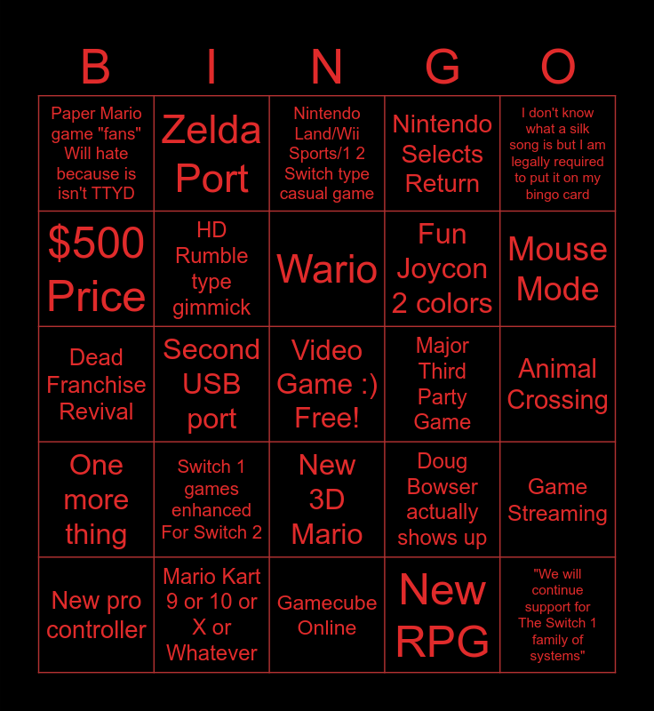 This bingo card has a free space and 24 words: Switch 1 games enhanced For Switch 2, Mario Kart 9 or 10 or X or Whatever, Wario, New pro controller, I don't know what a silk song is but I am legally required to put it on my bingo card, Paper Mario game "fans" Will hate because is isn't TTYD, $500 Price, Zelda Port, Major Third Party Game, New 3D Mario, Fun Joycon 2 colors, Dead Franchise Revival, Doug Bowser actually shows up, Game Streaming, HD Rumble type gimmick, New RPG, Animal Crossing, Nintendo Land/Wii Sports/1 2 Switch type casual game, Mouse Mode, Second USB port, "We will continue support for The Switch 1 family of systems", One more thing, Nintendo Selects Return and Gamecube Online.