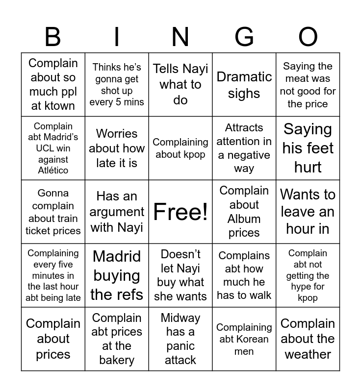 This bingo card has a free space and 24 words: Complain about prices, Madrid buying the refs, Complaining about kpop, Complaining abt Korean men, Saying the meat was not good for the price, Complain about so much ppl at ktown, Thinks he’s gonna get shot up every 5 mins, Tells Nayi what to do, Complain about Album prices, Wants to leave an hour in, Gonna complain about train ticket prices, Worries about how late it is, Complains abt how much he has to walk, Complain abt not getting the hype for kpop, Complain abt Madrid’s UCL win against Atlético, Complain abt prices at the bakery, Midway has a panic attack, Dramatic sighs, Saying his feet hurt, Complaining every five minutes in the last hour abt being late, Has an argument with Nayi, Doesn’t let Nayi buy what she wants, Attracts attention in a negative way and Complain about the weather.